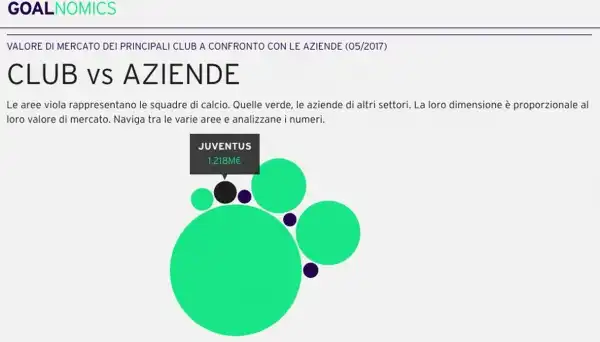 Andrea Agnelli (o chissà, presto sua madre?) per la Juventus; Suning (catena cinese di elettronica) per l’Inter; il gruppo Rossoneri Sport Investment Lux (ancora un’azienda cinese, dopo trent’anni di era Berlusconi-Finivest) per il Milan; Aurelio De Laurentiis per il Napoli. Se è facile farsi un’idea dei gruppi imprenditoriali e delle grandi famiglie dietro ai maggiori club italiani, meno immediato è guardare alle squadre come vere e proprie imprese e a confrontare la portata di un club di calcio con quella di una grande azienda di un altro settore. Goalnomics viene in aiuto anche su questo, offrendo una soluzione in grado di evidenziarne il valore di mercato e di confrontare – in maniera visiva – le quattro squadre italiane piú forti a livello economico con alcune famose aziende del Bel Paese.