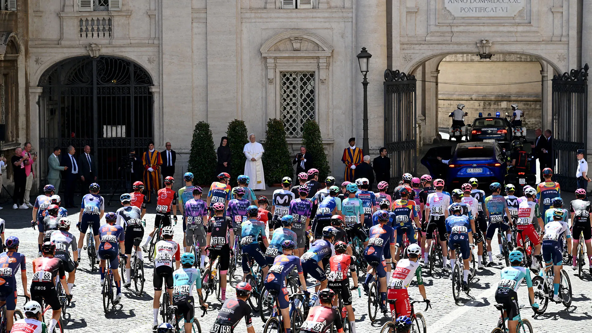 Home » Altri sport » Ciclismo Le storiche immagini del Papa al Giro d’Italia 2 Giugno 2025 Le storiche foto di Papa Leone al Giro d'Italia Il Pontefice ha incontrato i ciclisti prima del via dell'ultima tappa della corsa Un incontro di pochi minuti ma storico e molto significativo Papa Leone ha ricevuto una maglia rosa dagli organizzatori della corsa Poi ha stretto la mano a Simon Yates (vincitore del Giro), Isaak Del Toro (miglior giovane), Lorenzo Fortunato (miglior scalatore) e Mads Pedersen (vincitore della classifica a punti) Tutti i ciclisti erano molto emozionati "È un piacere salutare quest'ultima tappa del Giro d'Italia, spero che per tutti voi sia una giornata bellissima" "Sappiate che siete modelli per i giovani di tutto il mondo" "Vi ringrazio per quello che fate, spero che come avete imparato a curare il corpo, anche lo spirito sia sempre benedetto" I ciclisti hanno percorso piazza San Pietro, i giardini Vaticani prima di iniziare l'ultima tappa 1 / 10 Prossima Gallery Le storiche foto di Papa Leone al Giro d'Italia © Getty Images Papa Leone XIV TG SPORT Articoli correlati Filippo Ganna ritrova un vecchio amico in ammiraglia Una nuova squadra per Fernando Gaviria Smette Esteban Chaves, vinse uno storico Giro di Lombardia Ciclismo, nuova era per la Nazionale: Elia Viviani team manager, Roberto Amadio c.t. strada èlite Wout van Aert svela un retroscena sul suo momento più difficile Tadej Pogacar, tre importanti corse nel mirino per il 2026