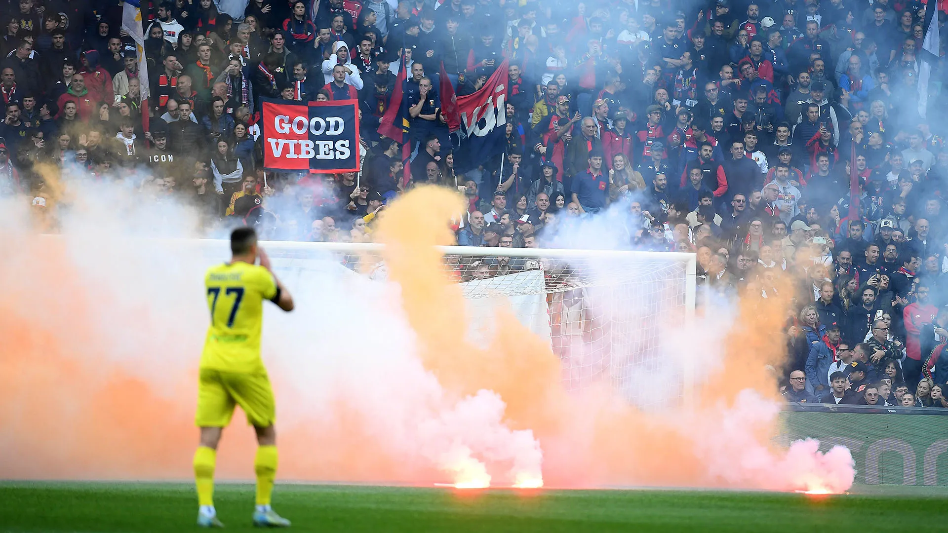 Home » Calcio Vergogna a Genova: fumogeni contro il portiere avversario, le foto 24 Aprile 2025 Vergogna a Genova: fumogeni contro il portiere avversario La partita contro la Lazio è stata sospesa 5 minuti Alcuni tifosi del Genoa hanno lanciato sul terreno di gioco dei fumogeni L'arbitro ha immediatamente sospeso il match per ragioni di sicurezza Non si vedeva nulla ed era troppo pericoloso stare in campo Uscendo, il portiere della Lazio Mandas è stato colpito da un fumogeno "Ero girato, ho sentito la schiena bruciare" ha detto dopo la partita Fortunatamente il portiere non si è fatto male ma certe cose non dovrebbero mai accadere Sono entrati in campo i pompieri per togliere i fumogeni dal terreno di gioco Le autorità competenti faranno tutte le indagini del caso per risalire ai responsabili Sui social molti tifosi della Lazio e non solo hanno criticato duramente l'accaduto 1 / 11 Prossima Gallery Vergogna a Genova: fumogeni contro il portiere avversario © Getty Images Genoa Lazio TG SPORT Articoli correlati La regola inventata per Bologna-Juventus fa irritare Fabio Caressa Bologna-Juventus, le formazioni ufficiali Addio a Ido Sgrazzutti, giocò con Palermo e Udinese Liga 2025-2026: Alaves-Real Madrid, le probabili formazioni Ligue 1 2025-2026: Marsiglia-Monaco, le probabili formazioni Bundesliga 2025-2026: Bayern Monaco-Mainz, le probabili formazioni