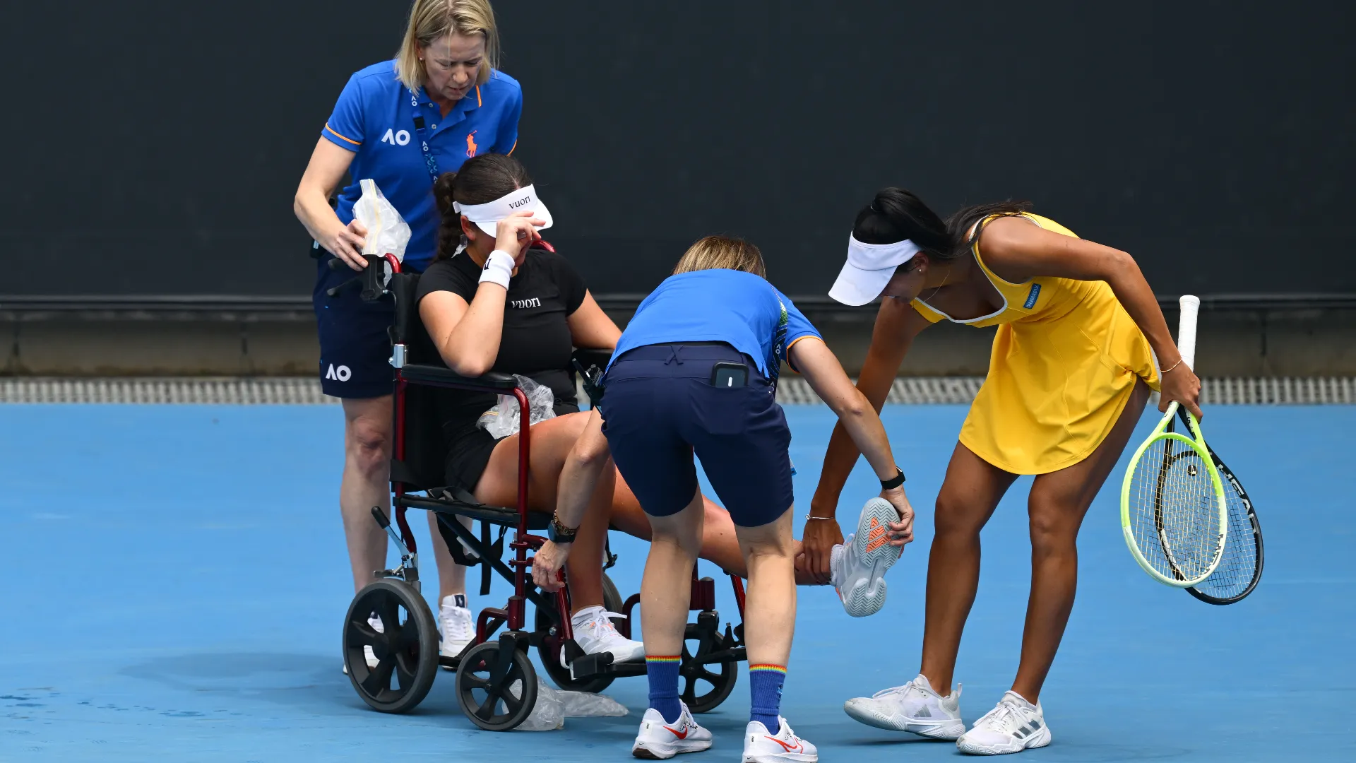 La tennista è disperata e viene portata via sulla sedia a rotelle: le immagini